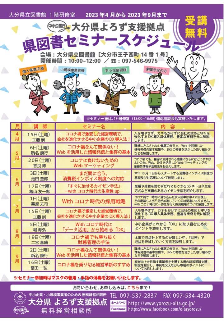 ・コロナウイルス感染症拡大や荒天等により中止する場合は、大分県立図書館ホームページでもお知らせします。(「新着情報」及び「お知らせ」のページ内で)