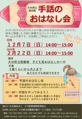 小さいお子さんから楽しめる手話のおはなし会を開催します。絵本に関連した手話に挑戦するコーナーもあります。